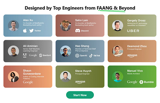 ByteByteGo’s content is not just theoretical — it reflects current industry practices, which is crucial in a rapidly evolving tech landscape and most of their books and courses are designed by ex-FAANG engineers as shown below